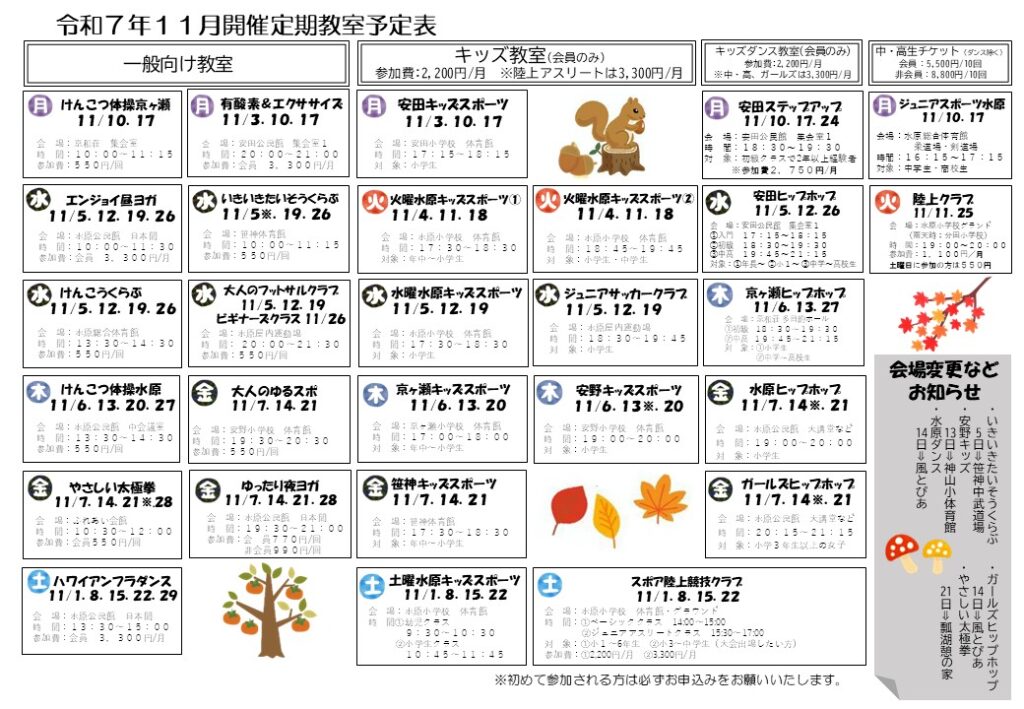 どのクラスも体験の場合はご連絡の上ご参加をお願いいたします!